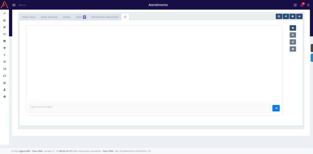 Nesse momento, será criada uma ação no atendimento, que registrará todo o histórico da conversa entre os participantes (atendentes e solicitantes), incluindo os anexos enviados, que também estarão dispostos no atendimento. Essa ação será do tipo específico do Chat ao vivo e terá características diferentes das demais ações do sistema, exibindo o histórico em um formato semelhante da conversa original.
