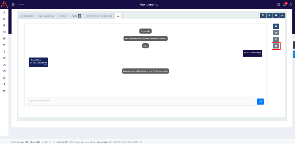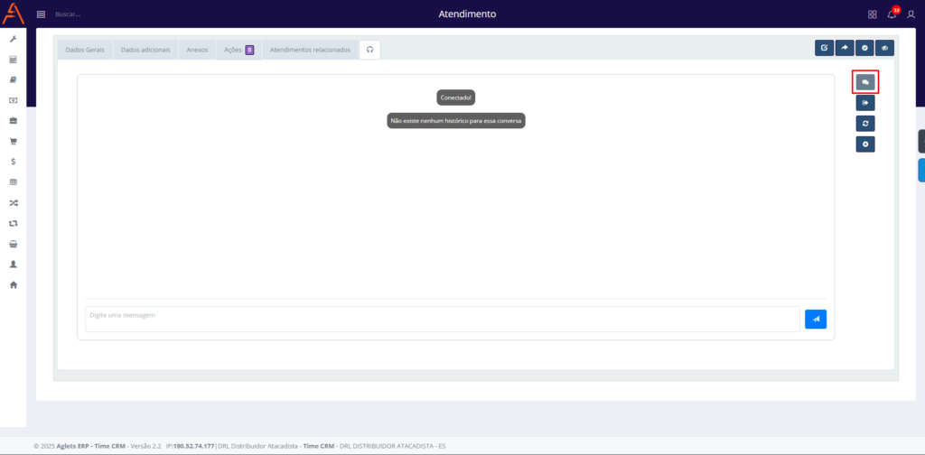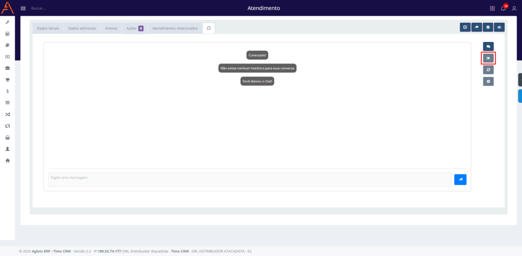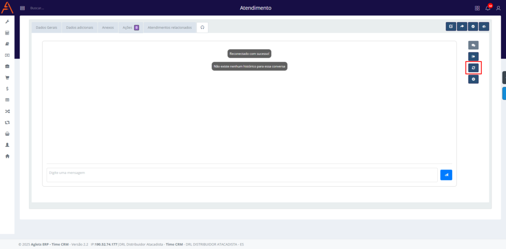 É possível utilizar o botão de “Reconectar ao chat” caso o atendente perca a conexão com a sala. O atendente será reconectado e o histórico do chat em andamento será carregado novamente, para que não perca o andamento da conversa.