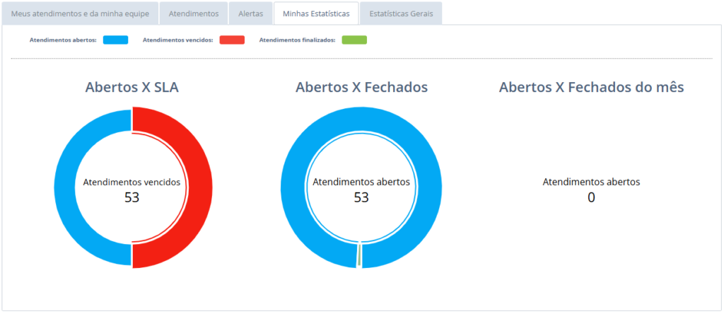 A aba Meus Atendimentos é muito similar a aba Atendimentos, a diferença é que os atendimentos exibidos aqui são apenas do usuário logado. Um coordenador de uma equipe do CRM pode visualizar, além dos seus atendimentos, os atendimentos dos atendentes de sua(s) equipe(s), e nesse caso, o nome da aba será exibido como “Meus atendimentos e de minha equipe”.