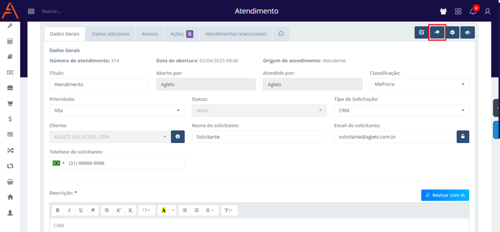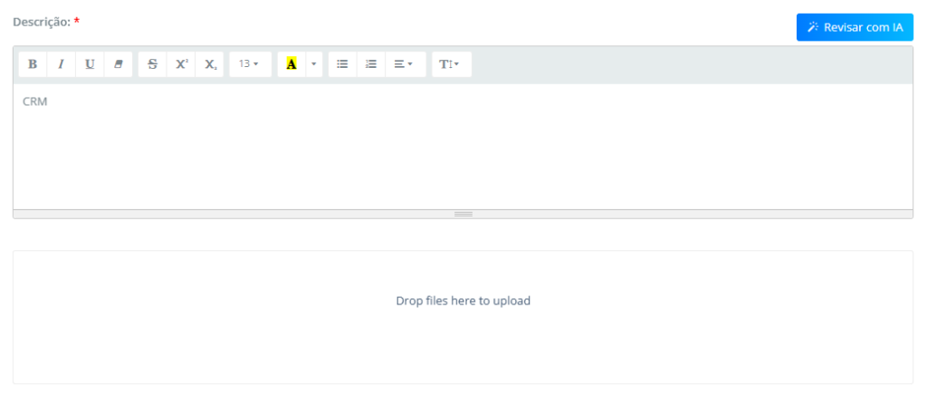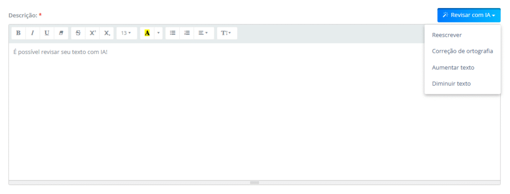 O CRM disponibiliza para os seus atendentes, através do Portal ERP o uso de Inteligência artificial para ajuste textuais no preenchimento da descrição do atendimento, na criação de ações, no encaminhamento, no uso do Chat ao vivo e ao finalizar um atendimento. O botão de Revisar com IA fornece algumas opções de revisão textual para o usuário. São elas: