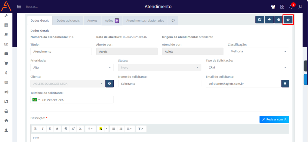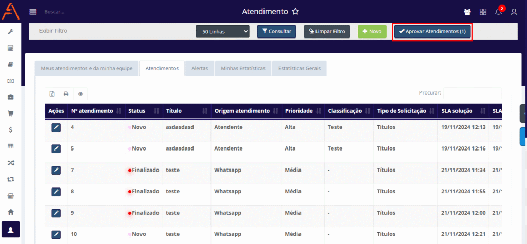 - Ações: Nesta coluna fica disposto o botão de visualização e edição do atendimento;