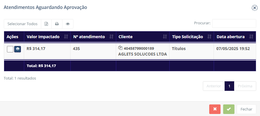 Ao clicar nele, será aberto um modal que mostrará os atendimentos que foram encaminhados para esse coordenador responsável e ele poderá aprovar ou reprovar os atendimentos. O usuário pode selecionar um por um ou utilizar o botão de selecionar todos para aprovar/reprovar todos de uma vez.