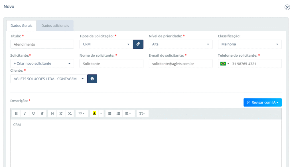 - Solicitante: Informa o nome da pessoa que solicitou o atendimento;