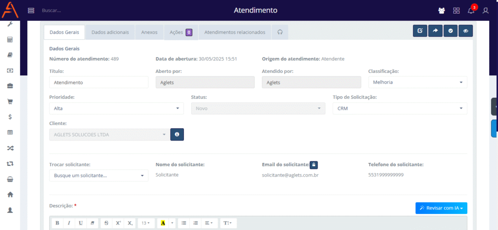 - E-mail do solicitante: Exibe o e-mail do solicitante;