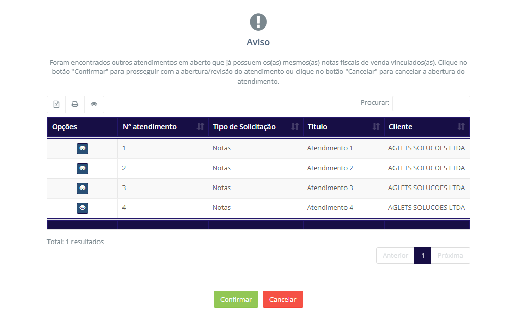 - Nota Fiscal: Retorna atendimentos relacionados à NF informada;