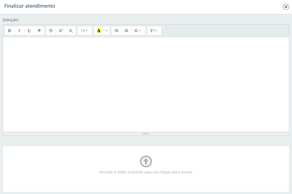 Um modal será aberto para informar a solução, que é um campo obrigatório para finalizar qualquer atendimento. Além disso, no dropzone abaixo do pop-up de finalizar atendimento será possível anexar arquivos. Eles serão registrado juntos as ações criadas nesses passos e ocuparão também a aba de Anexos do atendimento, na seção de anexos das ações: