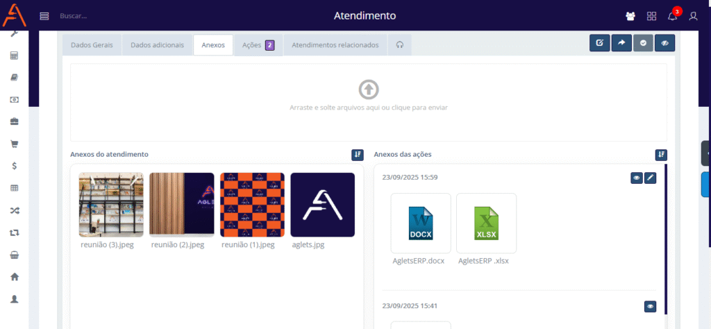Os anexos das ações serão separados por cada ação, mostrando a data delas. É possível visualizar a ação clicando no ícone de “Olho” ou edita-la clicando no ícone de “Lápis”. Os anexos das ações de chat ao vivo, encaminhamento e finalização do atendimento também serão exibidos nessa seção.