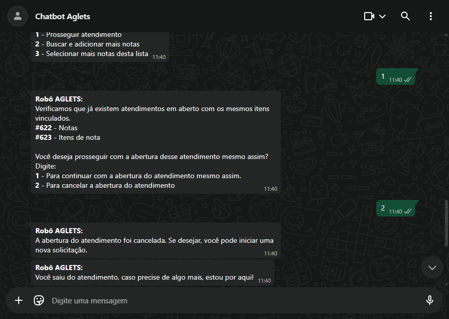 O usuário poderá selecionar a opção “1” para prosseguir com a abertura do atendimento ou selecionar a opção “2” para cancelar todo o processo de abertura do atendimento. Nesse segundo caso, a abertura do atendimento será cancelada e a sessão do usuário com o Chatbot será finalizada, sendo necessário iniciar uma nova conversa para prosseguir com a interação.