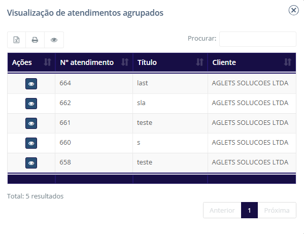 - Olho: Essa funcionalidade tem como principal função acessar o atendimento. Ao clicar no botão de olho, o usuário será redirecionado para o atendimento em questão.