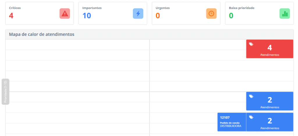 - Mapa de calor dos atendimentos: Exibe um mapa de calor, em formato de matriz, que distribui os atendimentos de acordo com sua prioridade e vencimento do SLA. Cada atendimento será exibido em formato de cartão, que mostrará seu número, título e cliente associado.