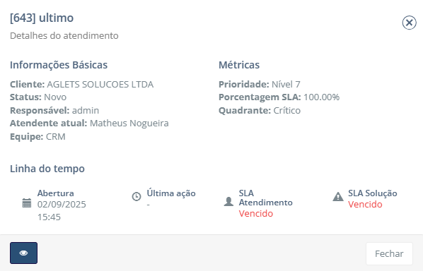 - Linha do tempo: Exibe dados do atendimento como data de abertura, data da última ação, status do SLA de Atendimento e de Solução.