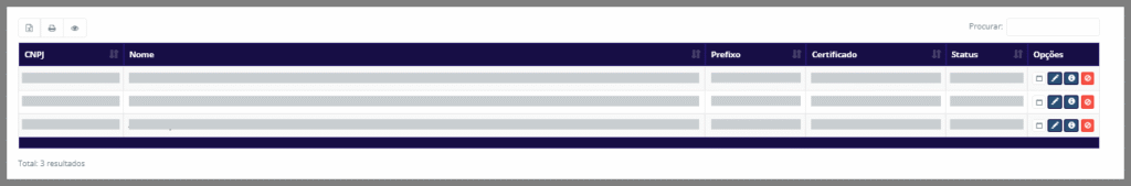 Na tela Gestão de empresas, a coluna de Ações contém quatro ícones para auxiliar no gerenciamento das empresas. As funcionalidades desses ícones serão explicadas abaixo: