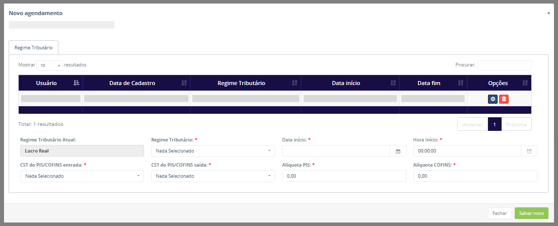 - Regime tributário: Exibe o novo regime tributário que será adotado após a data de ínicio do agendamento de tributação.