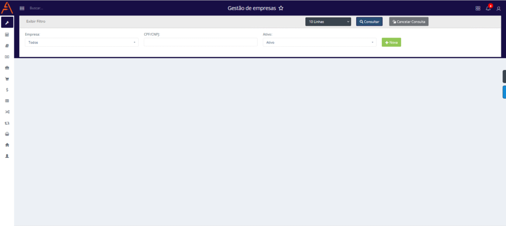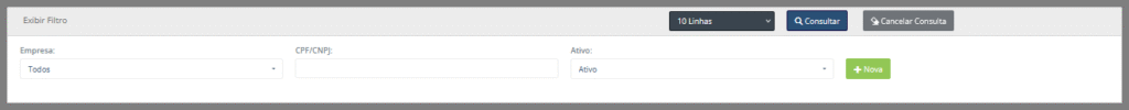 - Ativo: Selecione o status associado à empresa pela qual deseja filtrar, podendo ser Ativo, Inativo ou Todos.