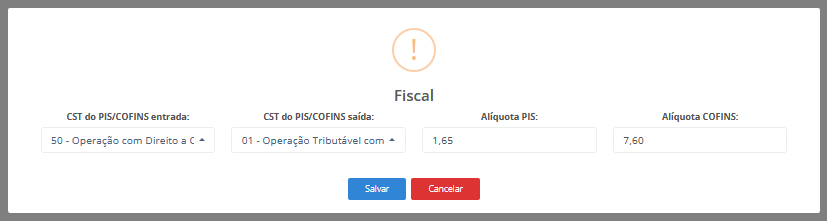 - CST do PIS/COFINS entrada: Selecione o CST (Código de Situação Tributária) aplicável às operações de entrada com relação ao PIS/COFINS.