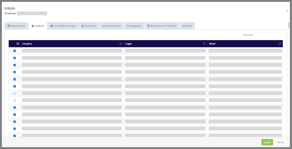 Nela é exibida uma tabela com todos os usuários vinculados àquela empresa. Apenas os usuários selecionados têm acesso, ou seja, somente eles conseguem visualizar e utilizar o sistema por meio daquela empresa.