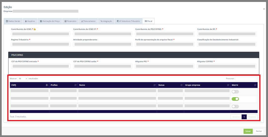 Atenção: A tabela com as empresas matriz e filiais na aba Fiscal não está disponível durante a criação de uma nova empresa ao clicar em Novo. Ela só pode ser acessada pelas funcionalidades Editar e Informações, porém somente na opção Editar é possível realizar alterações.