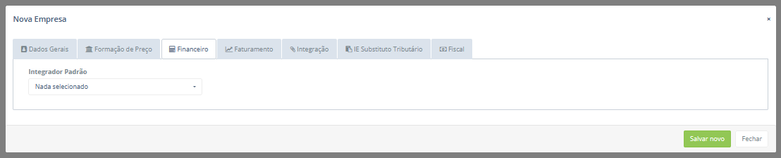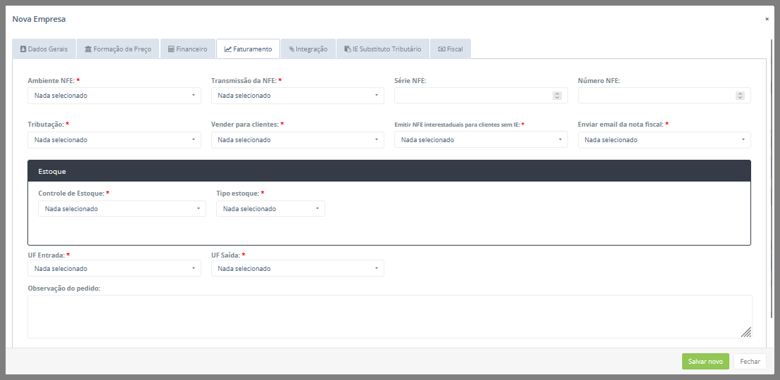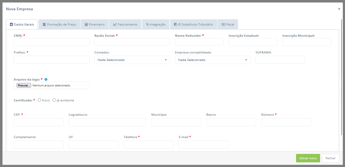 Após isso, será exibido um pop-up para a criação de uma nova empresa. Nele, existem sete abas: Dados gerais, Formação de preço, Financeiro, Faturamento, Integração, IE Substituto Tributário e Fiscal. Inicialmente, os campos que compõem a aba Dados gerais serão descritos a seguir: