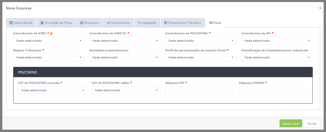 - Contribuinte de PIS/COFINS: Selecione se a empresa é uma indústria sujeita à tributação do PIS (Programa de Integração Social) e da COFINS (Contribuição para o Financiamento da Seguridade Social). As opções disponíveis são: Sim e Não.