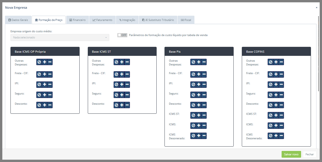 Após preencher os campos da aba Dados gerais, acesse a aba Formação de preço. Os campos que compõem a aba Formação de preço serão explicados abaixo: