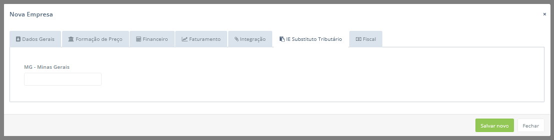 Atenção: Na aba IE Substituto Tributário, são exibidos os campos para preenchimento da inscrição estadual nos estados onde a empresa realiza vendas. Serão exibidos apenas os estados selecionados no campo UF de saída, localizado na aba Faturamento.