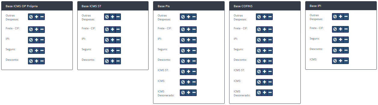 Eles são representados por três ícones, cada um influenciando de forma diferente o cálculo do preço das bases de cálculo.