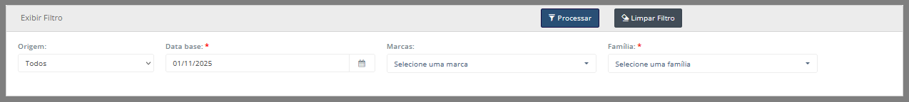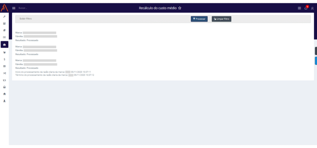 • Processar: Ao clicar em Processar, o recálculo será executado para os campos definidos no filtro pelo usuário. Isso significa que todas as opções selecionadas serão consideradas no recálculo do custo médio das famílias de produtos das marcas escolhidas, dentro do período informado.