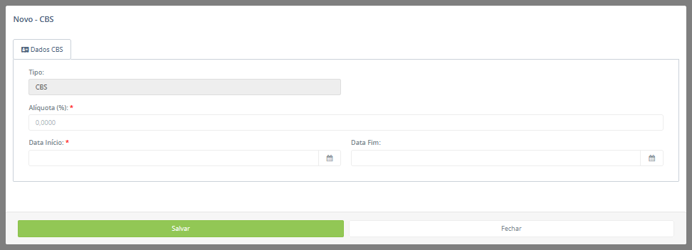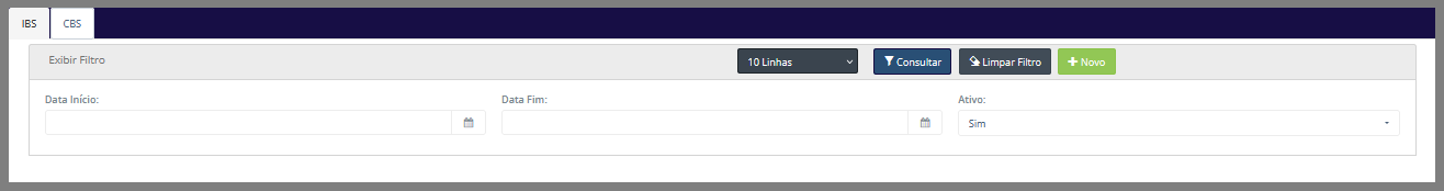 - Data de início: Exibe a data de início do período de vigência do parâmetro de CBS.