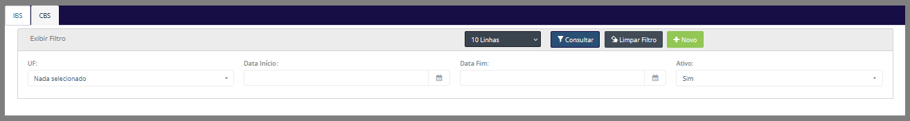 Essa tela é subdividida em duas abas, IBS e CBS, sendo que cada uma possui funcionalidades específicas, conforme a aba em que o usuário estiver, funcionando como telas independentes. Dessa forma, se o usuário estiver na aba IBS, todas as funcionalidades exibidas serão voltadas exclusivamente ao IBS, e o mesmo ocorre na aba CBS.