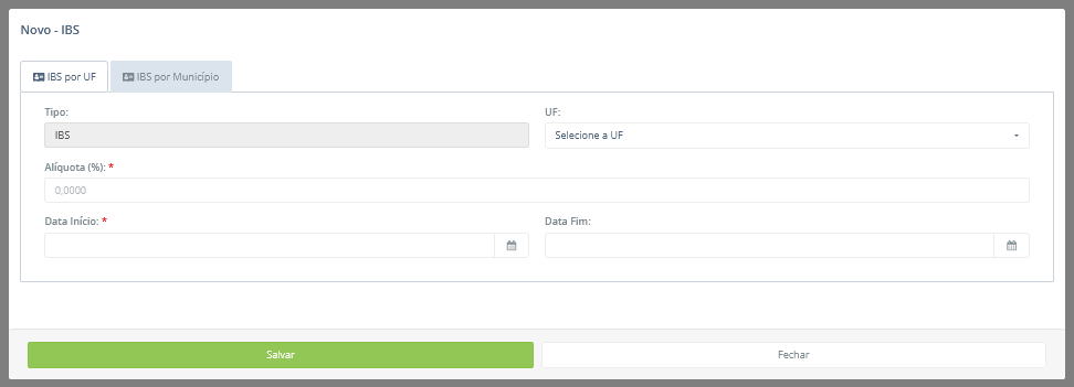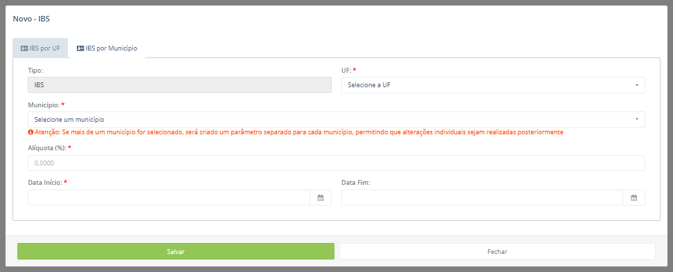 Atenção: Um parâmetro de IBS pode ser criado ou por UF, pela aba IBS por UF, ou por município, pela aba IBS por Município, não sendo possível utilizar ambas as abas ao mesmo tempo. Por exemplo, se o usuário iniciar o preenchimento na aba IBS por UF e, antes de salvar, trocar para a aba IBS por Município, todas as informações preenchidas na aba anterior serão descartadas, sendo necessário iniciar um novo preenchimento pela aba IBS por Município.
