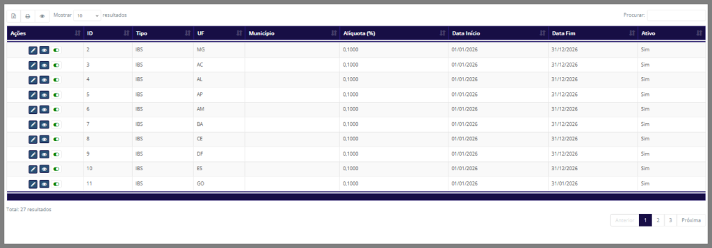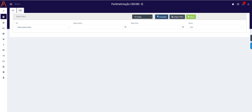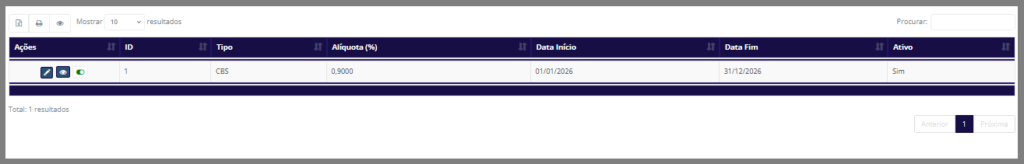 - Ativo: Exibe o status atual do parâmetro de CBS, podendo ser Ativo ou Inativo.
