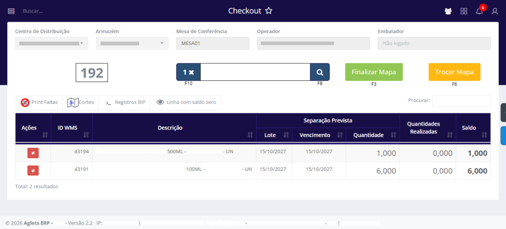 A tela Checkout no sistema Aglets ERP tem como objetivo realizar a conferência e validação dos itens separados presentes no Mapa de Separação, antes de ser liberado para o transporte.