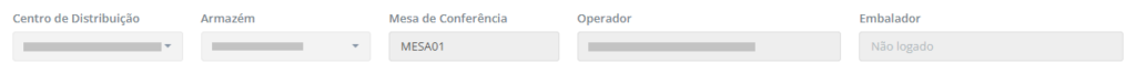 Na parte superior da tela principal do Checkout, são exibidos os campos de filtro e identificação operacional, que exibem o contexto no qual a conferência será realizada. Esses campos são carregados automaticamente de acordo com o operador logado, o armazém e a mesa de conferência.
