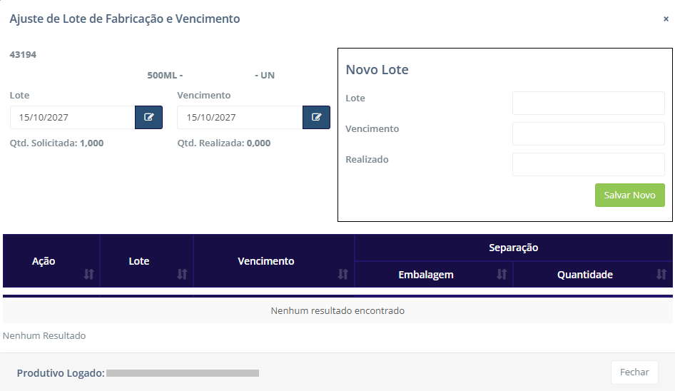 Lote – Vencimento Divergente: Este botão permite ao operador ajustar o lote e a data de validade do produto. Além disso, também possibilita a criação de um novo lote para o produto. Para isso, ao clicar no botão é aberto o seguinte modal: