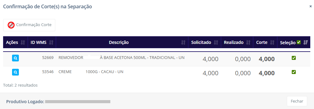 Ainda no modal de Corte, a coluna Ações contem um ícone para ajudar na conferência.