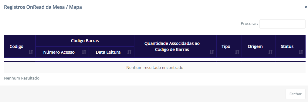 Exibe o histórico de leituras do(s) SKU(s) conferidos: Este botão exibe o histórico das leituras dos produtos conferidos. Para isso, ao clicar no botão é exibido o seguinte modal: