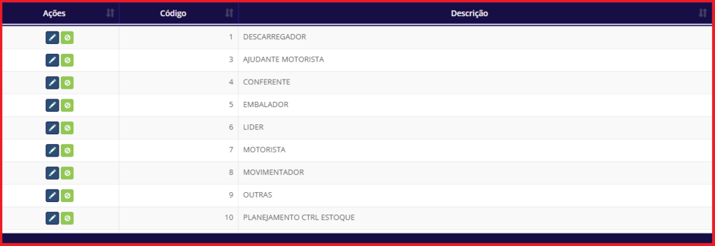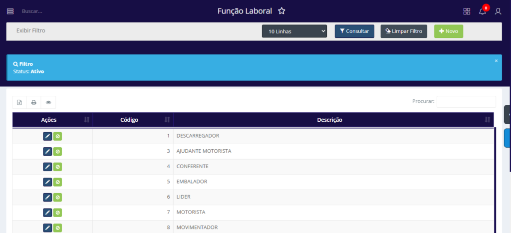 Através dessa tela o usuário pode criar, editar, ativar e inativar funções laborais.