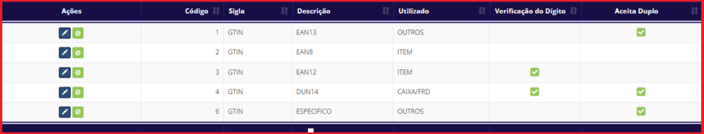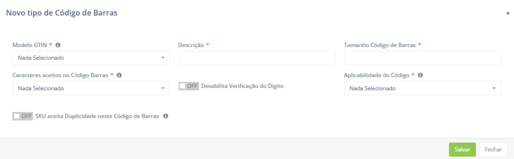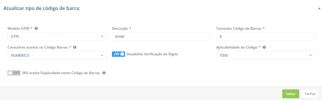 - Descrição: Nome do tipo de código de barras cadastrado.