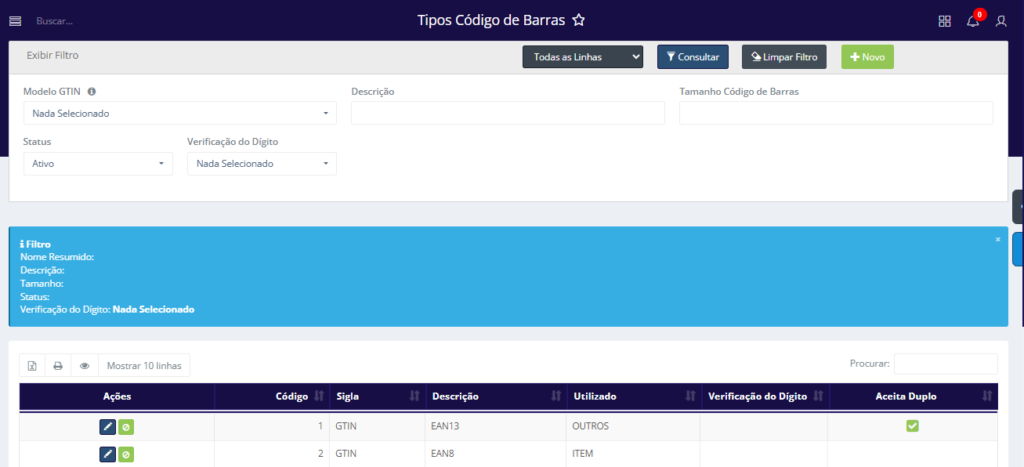 Ao acessar a tela de Tipos Código de Barras, é possível consultar os Tipos existentes no sistema utilizando o filtro disponível, que conta com cinco campos para auxiliar os usuários nas consultas. Os campos do filtro são: