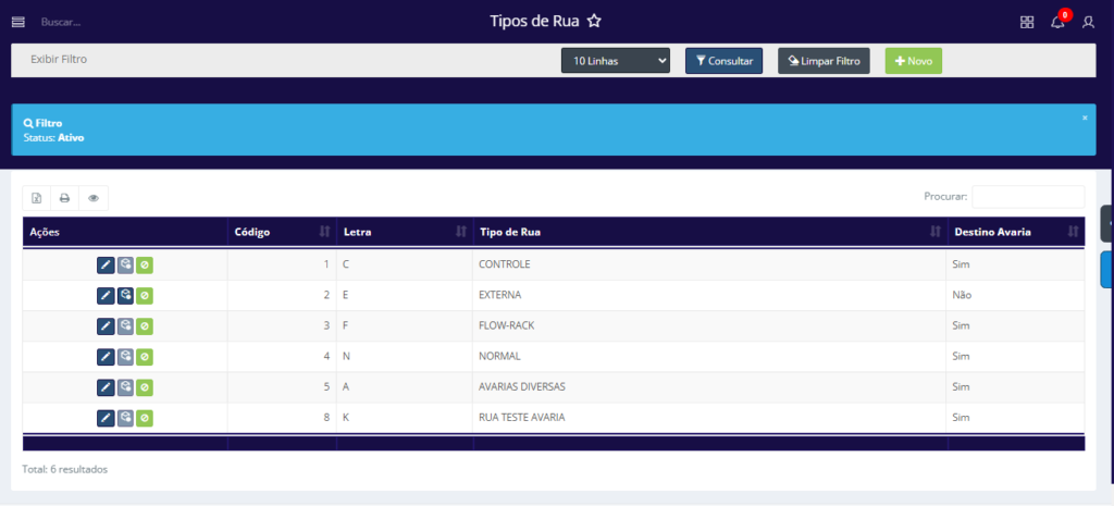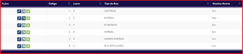 - Destino Avaria: Indica se o tipo de rua é destinado para armazenar produtos que estão com avaria.