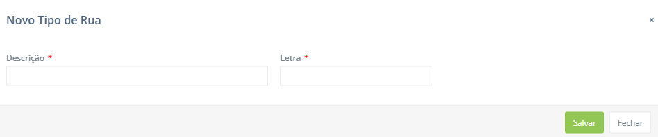 - Novo: Ao clicar neste botão, o usuário pode preencher as informações necessárias para criar um novo tipo de rua.