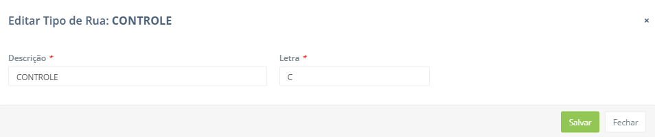 Editar: Este botão permite ao usuário editar o tipo de rua. Para isso, ao clicar no botão é aberto o seguinte modal: