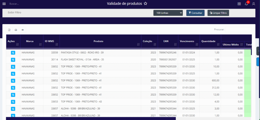 A tela Validade de Produtos no sistema Aglets ERP tem como objetivo gerenciar e monitorar os itens em estoque no armazém, fornecendo uma visão consolidada para o controle de qualidade.