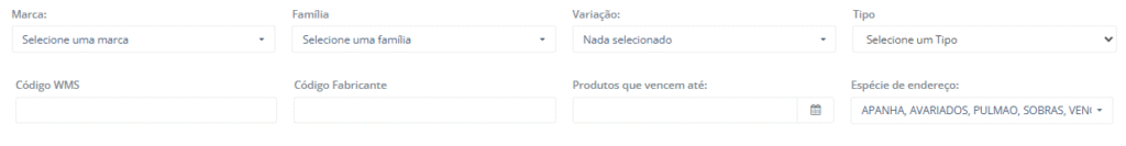 - Espécie de endereço: Localização do produto dentro do armazém.