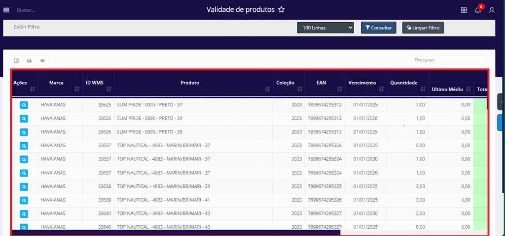 - 100 Linhas: Ao clicar neste botão, o usuário pode selecionar a quantidade de linhas que deseja visualizar na consulta. As opções disponíveis são: 10 Linhas, 50 Linhas, 100 Linhas, 1000 Linhas ou Todas as Linhas.