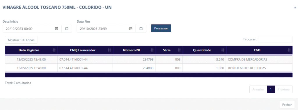 Visualizar NFs de Entrada do Produto: Permite a visualização de todas as NFs de Entrada de acordo com o período desejado. Ao clicar neste botão é aberto o seguinte modal: