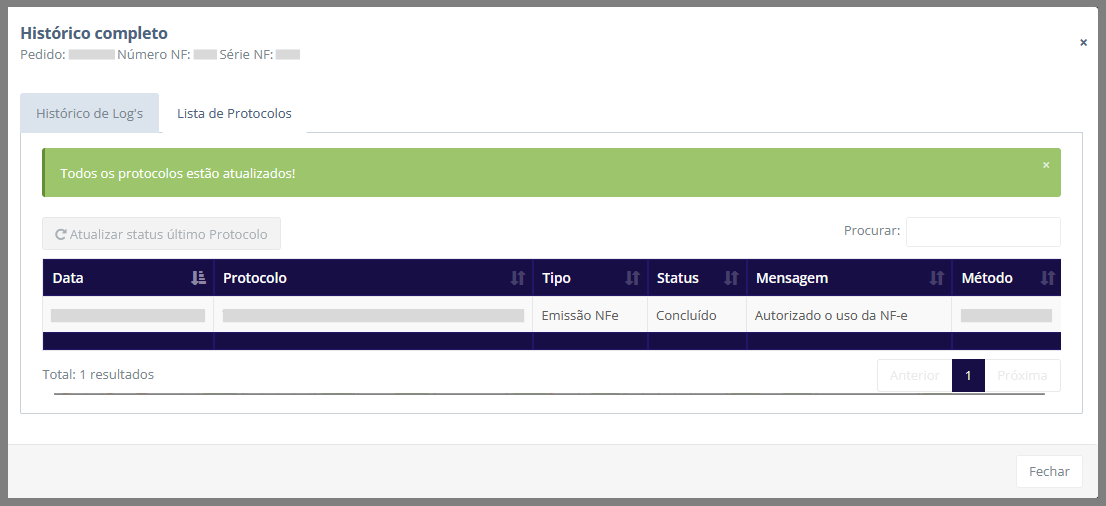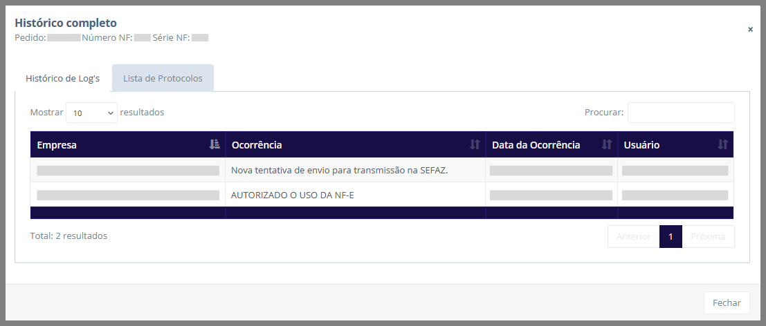 Ao clicar em Histórico completo, é exibido um novo pop-up com mais informações sobre a transmissão da nota fiscal, dividido em duas abas: Histórico de Log’s e Lista de protocolos.