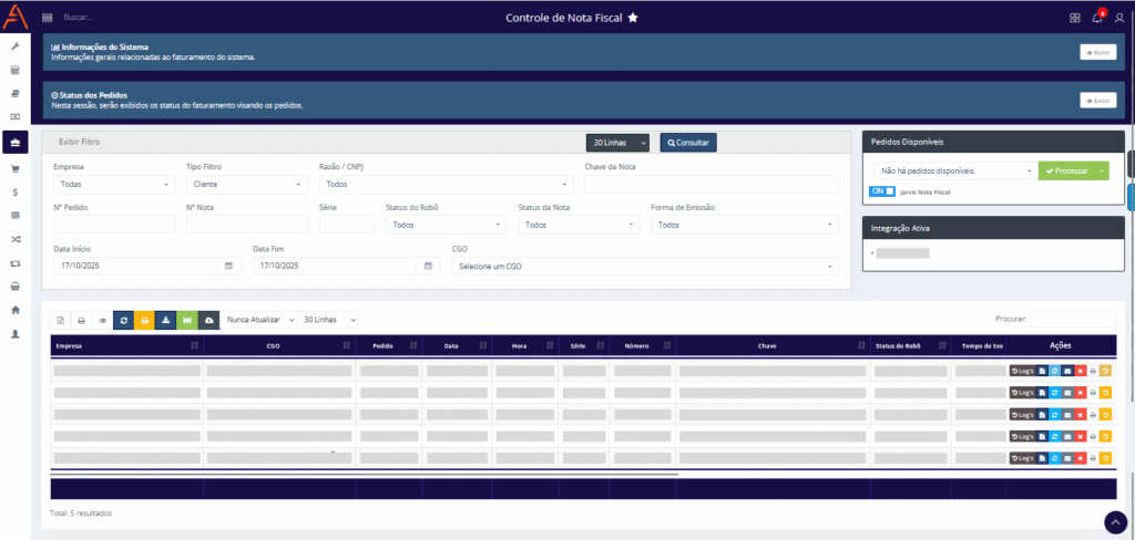 Ao lado do filtro da tela Controle de nota fiscal, encontra-se o controlador da automação de faturamento das notas fiscais, realizado por um robô quando a opção Jarvis Nota Fiscal está ativada. Se essa opção estiver desativada, o faturamento passa a ser feito apenas de forma manual. No entanto, é possível realizar ambos os processos de forma integrada, combinando o modo automático e o manual.