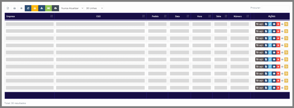 Todos os botões presentes sobre a tabela na tela Controle de nota fiscal