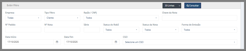 • CGO: Selecione o CGO associado à nota fiscal pela qual deseja filtrar.